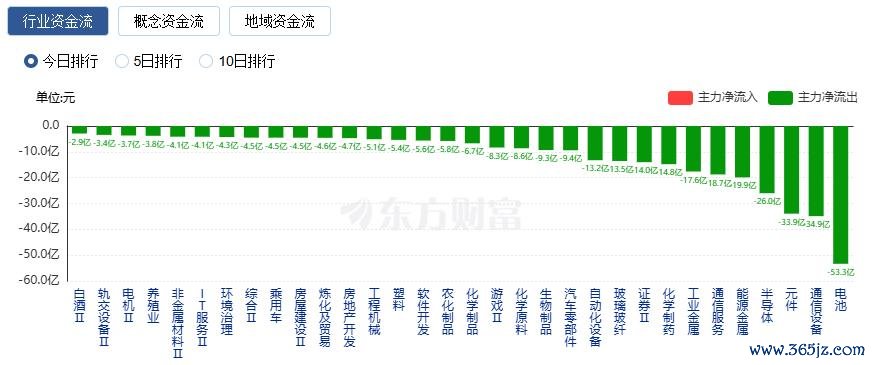 净流出方面,电池、通信设备、元件等净流出排名靠前,其中电池净流出53.34亿元。