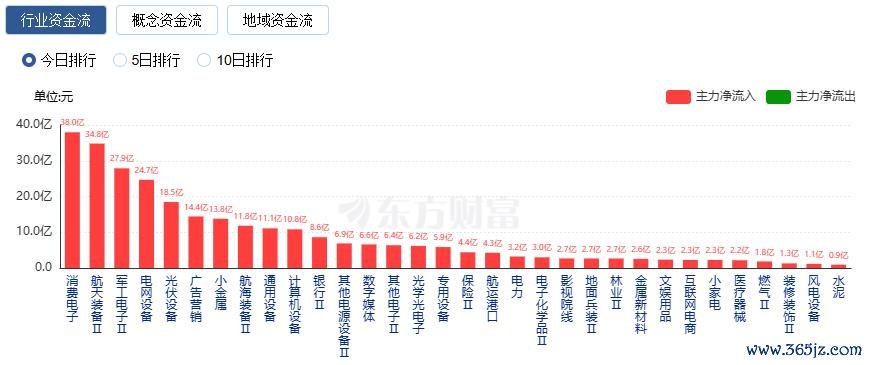 行业资金方面,截至收盘,消费电子、航天装备、军工电子等净流入排名靠前,其中消费电子净流入37.97亿。