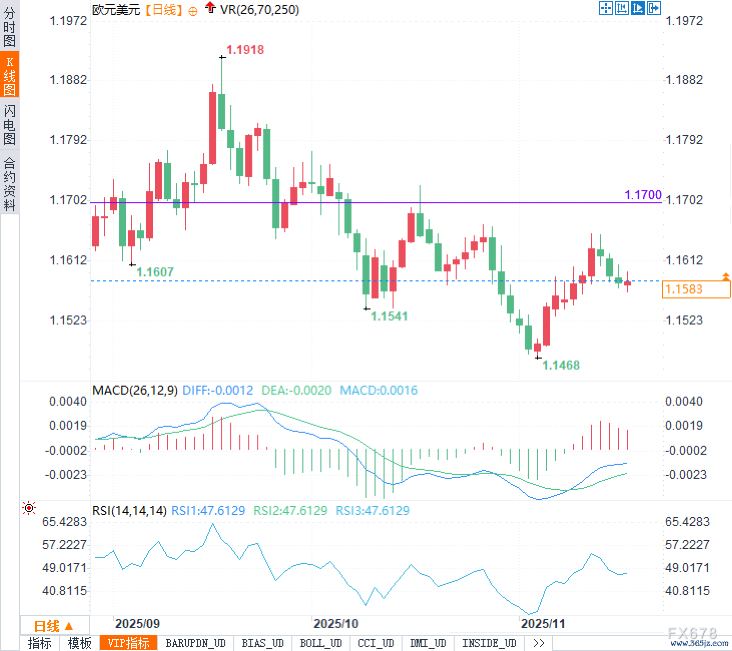 从日线图看,欧元兑美元自1.1918高点一路回落,阶段性低点在1.1468,整体仍处于自上而下的调整结构中。当前汇价在1.1580附近徘徊,略低于前期1.1607一带的密集成交区,短期呈现低位横向整理的特征。上方1.1700一线为前期多次受压位置,构成重要压制;下方关注1.1541及1.1468两个阶段性低点,对价格起到支撑作用。