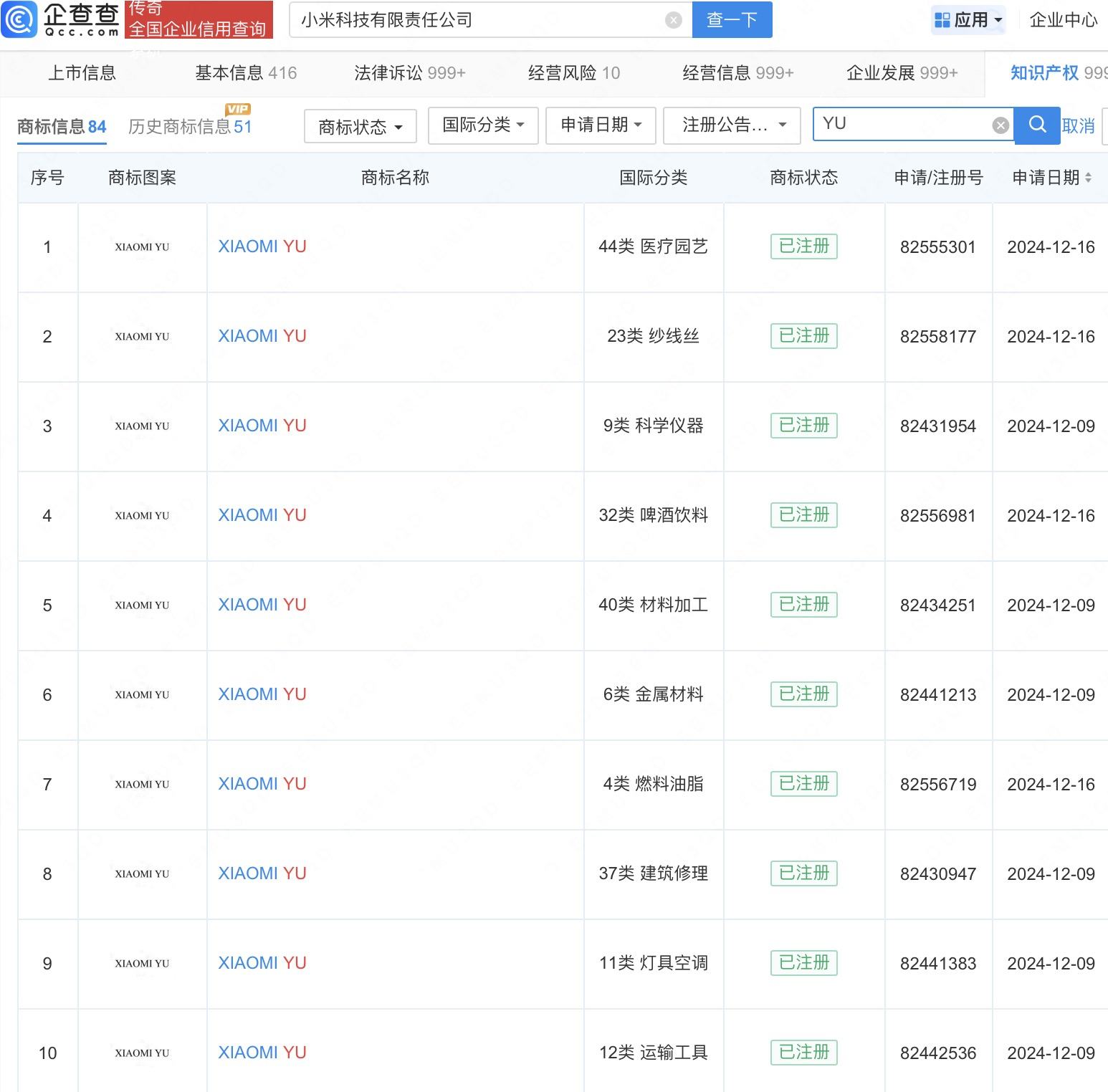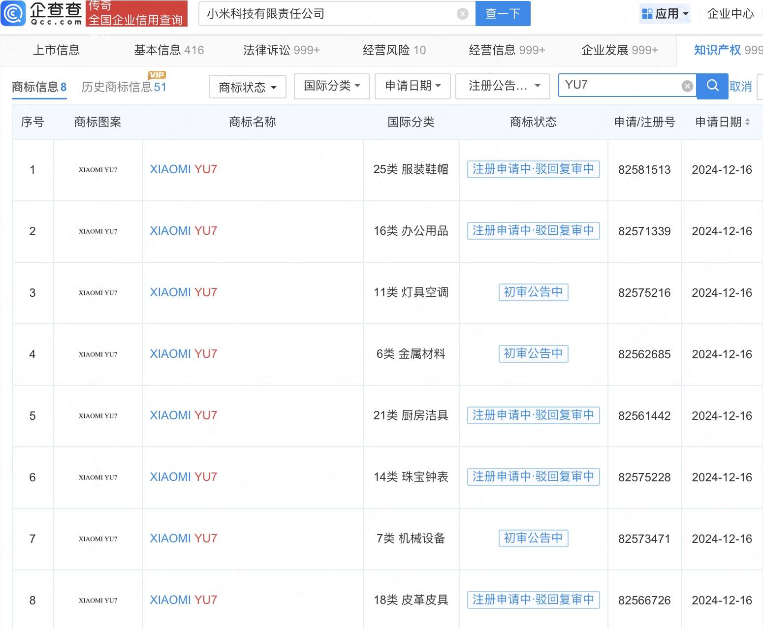 企查查APP显示,去年12月,小米科技有限责任公司申请注册“XIAOMI YU7”“XIAOMI YU”商标,国际分类涉及服装鞋帽、办公用品等。