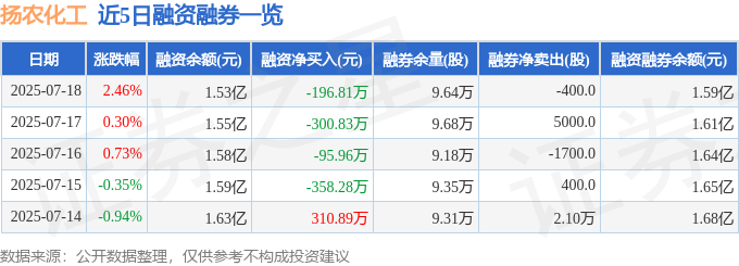 扬农化工融资融券信息显示,融资方面策略红,当日融资买入1063.39万元,融资偿还1260.2万元,融资净偿还196.81万元。融券方面,融券卖出700.0股,融券偿还1100.0股,融券余量9.64万股,融券余额589.23万元。融资融券余额1.59亿元。