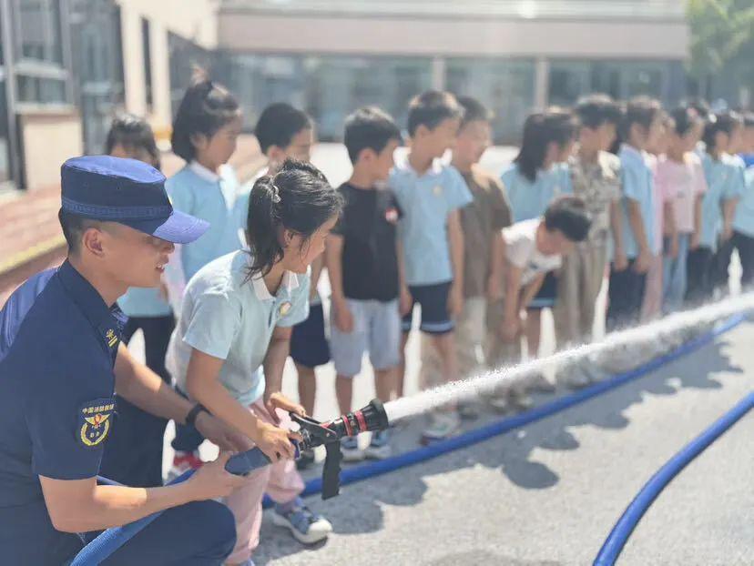最让孩子们兴奋的是模拟灭火环节。在消防员的保护下,孩子们手持高压水枪,体验了模拟灭火的场景。