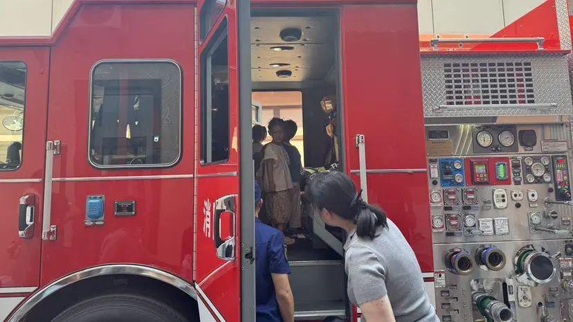 随后,孩子们有序登上消防车驾驶室,好奇地打量着车内设备,过了一把“驾驶”消防车的瘾。