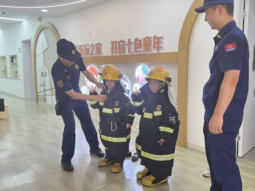 在消防员的帮助下,小朋友们轮流穿上消防服。尽管厚重的服装让他们动作略显笨拙,但孩子们立刻挺直小身板,模仿消防员敬礼的姿势,小脸上洋溢着自豪的光芒。